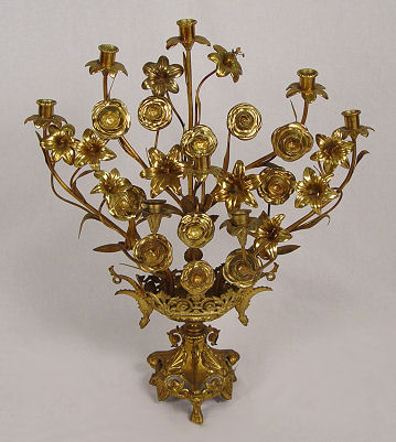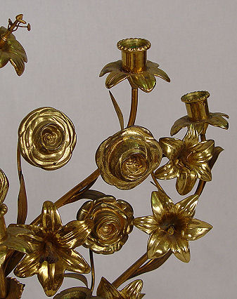 8 LIGHT GOLD GILT FLORAL CANDELABRA: Roses and lilies abound in a 8 light candle holder, 26''h. x 21''w.