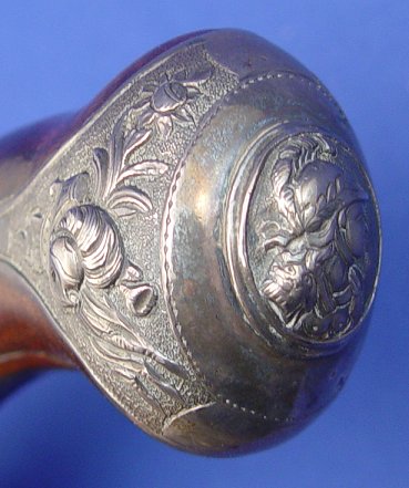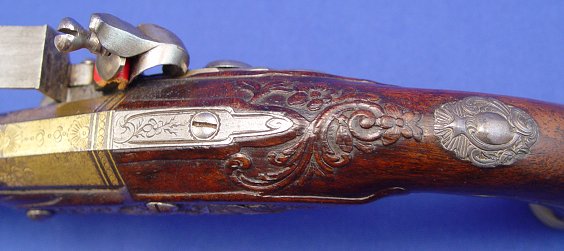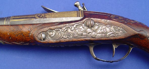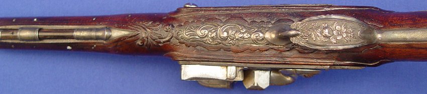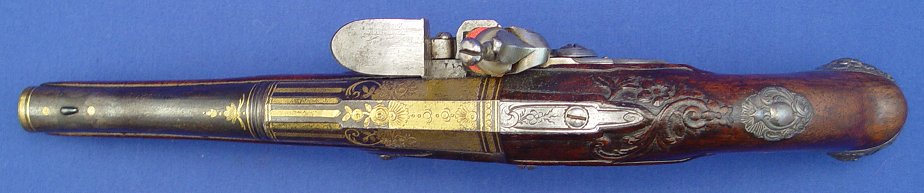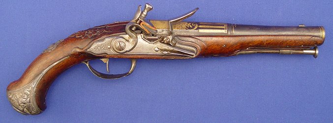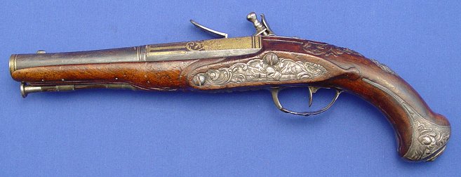 18TH? CENTURY FLINTLOCK PISTOL WITH EMBOSSED MASQUERON BUTT CAP: Tooled silver embellishments with touch marks, gilded barrel, probably Spanish, total length 13 1/4'', barrel, 7 1/4'', repair to wood over right side trigger guard. Sold as is.