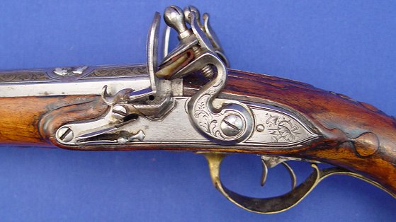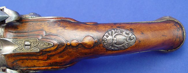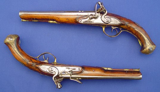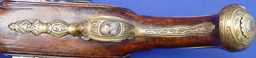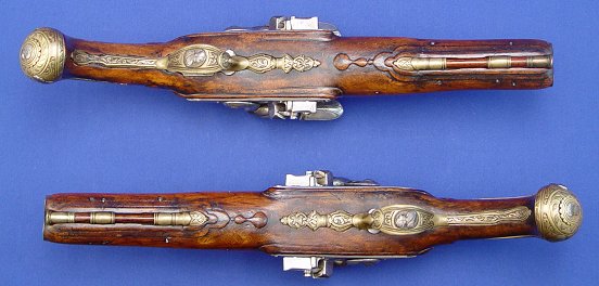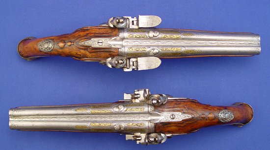 PAIR OF ITALIAN DOUBLE - BARRELED FLINTLOCK PISTOLS, CIRCA 1770: 14'' overall, barrel length 8'', decorated with an arrangement of inlaid brass panels, punched and engraved with scrolls and each enclosing a single female relief bust. Sold as is. Est. $8000/12000**