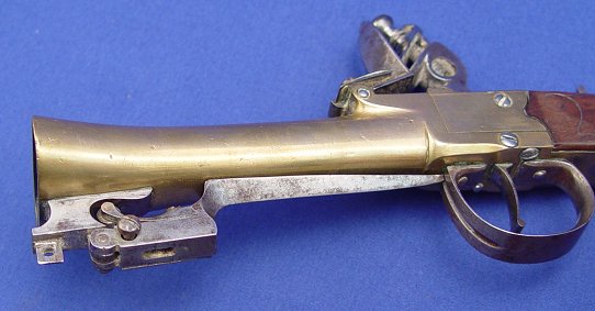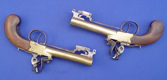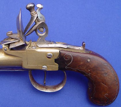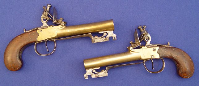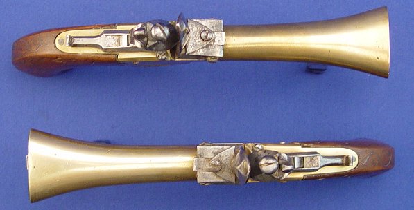PAIR 19TH?C FLINTLOCK PISTOLS, SPRING RELEASED BAYONETS: Silver wire inlay to handles, 8 1/4'', 11 1/2'' with bayonet extended, wide mouth barrel, 5 1/2'' l., metal separation at top of lock mechanism on one pistol, no visible markings. Sold as is.