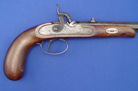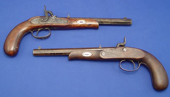 PAIR OF PERCUSSION DUELING PISTOLS: Age unknown, 15 1/2'' overall, 9 3/4'' barrels. Sold as is.