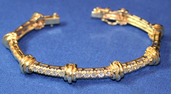 1.5CTW DIAMOND BRACELET: 14k yellow gold bar link bracelet with the top three bars set with five diamonds each. Approx. 10pt stones, bead set, other links with hand hammered appearance, pressure clasp with double safety, marked Pat 5309616, gold content assayed to 14k, curved design makes measurement of length approximation, 6''l., 24.5 grams.