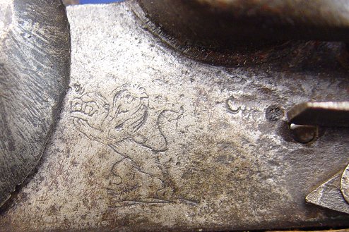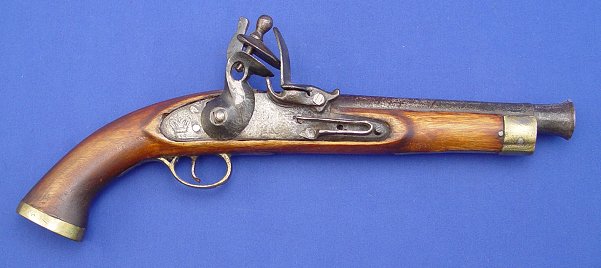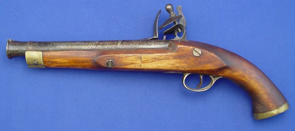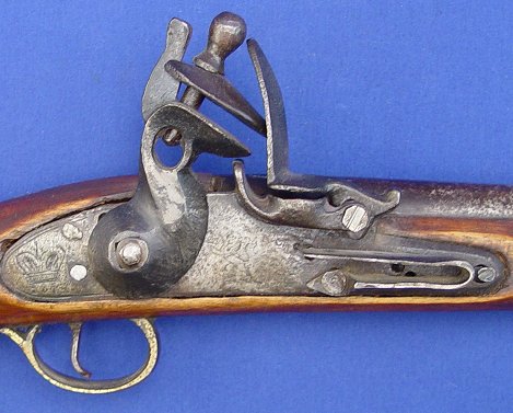 FLINTLOCK PISTOL WITH CROWN MARK: Probably 20th C. manufacture, 15 3/4'' overall, 9'' barrel. Sold as is.