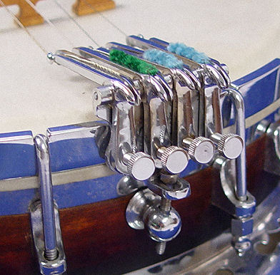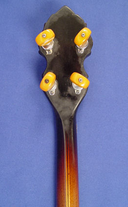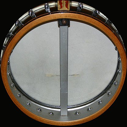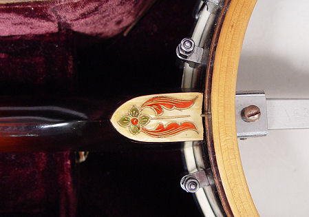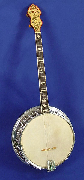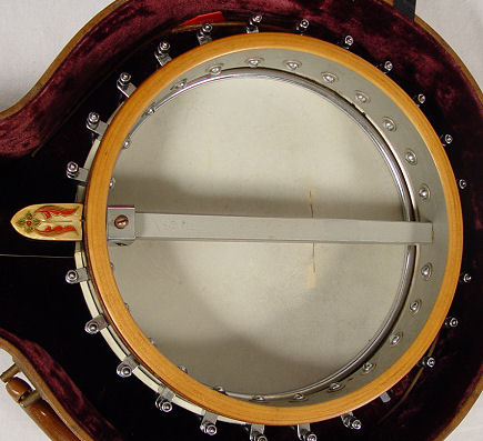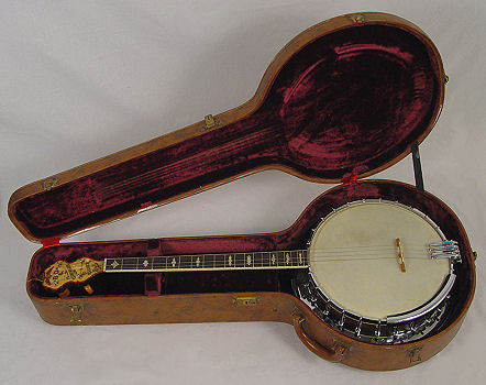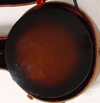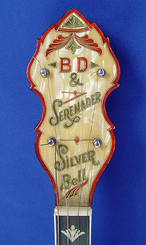 BACON & DAY (GRETSCH)SERENADER SILVER BELL BANJO: Ca. 1940's. 4 string tenor banjo in original case. Bakelite tuning pegs, one drum head tuner is missing. Great graphics on the neck, interior reveals serial number 6318, missing stem adjuster. 34''l.