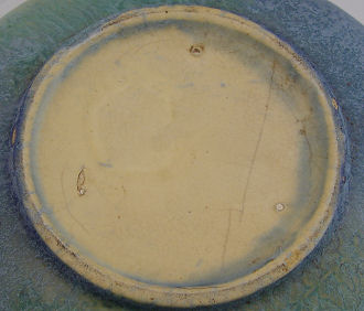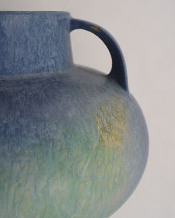 ROSEVILLE WINDSOR FERN VASE: Blue with subtle image of fern frond. Double handle vase. 7''h, 10'' dia. of body. Please note a few glaze pops, small chip under handle and on base.