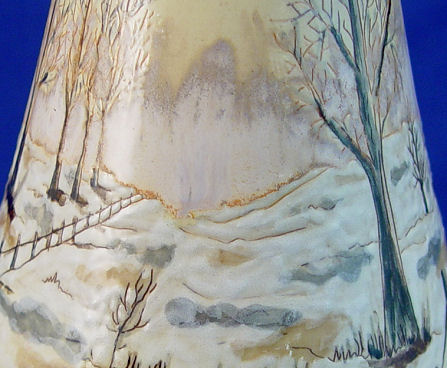 ARTIST SIGNED COBRIDGE ENGLISH ART POTTERY VASE: Cobridge is a division of Moorcroft, utilizing the skills of the same artists. Winter landscape scene, clear backstamps and artists marks. 8 3/4'' h.