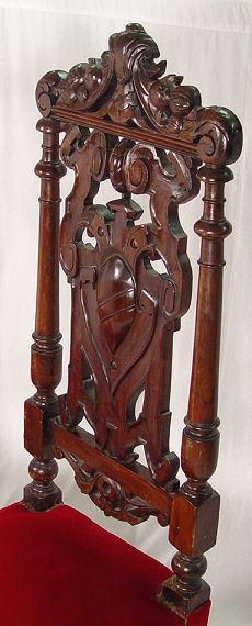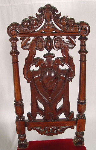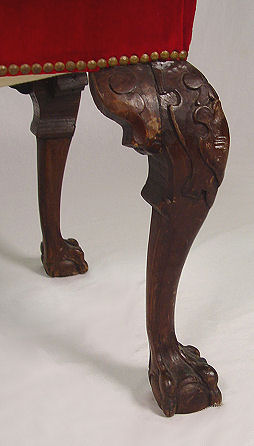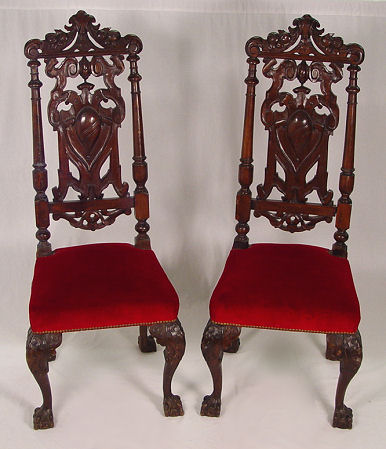 PAIR OF 19th C CARVED HIGH BACK SIDE CHAIRS: Carved and pierced back splat, carved ball and claw feet, velvet seats. Please note one has been repaired. 53 1/2''h. x 21'' x 19''.