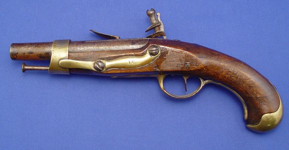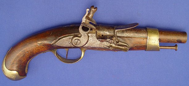 FRENCH ARMY FLINTLOCK PISTOL: With touchmarks and incised Mauberge mark to lock plate, 14'' overall, 6 3/4'' barrel, worn condition. Sold as is.