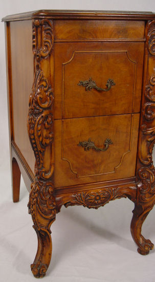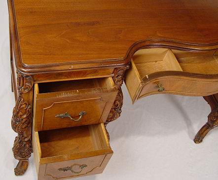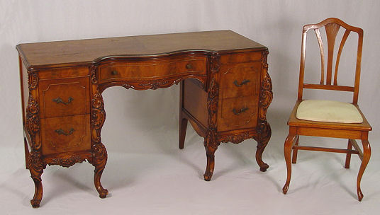 FRENCH STYLE CARVED DESK / DRESSING TABLE AND CHAIR: 5 drawer kneehole desk, carved cabriole legs, matching chair. 29 1/2''h. x 52'' x 19''.