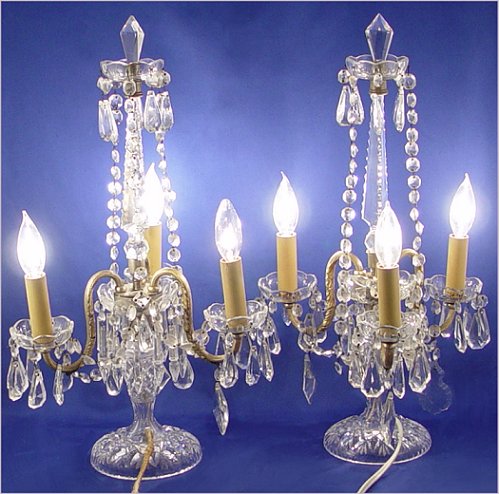 PAIR OF TABLE TOP CRYSTAL CHANDELIER CANDELABRA LAMPS: 3 curved arm lamps of cut crystal prisms and prism chains. One has original old cloth cord, one has replaced cord. 22''h. Please note repair to one bobeche.