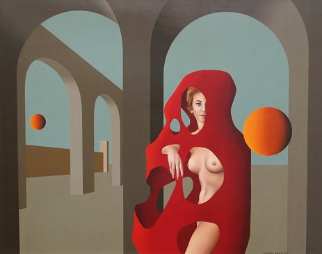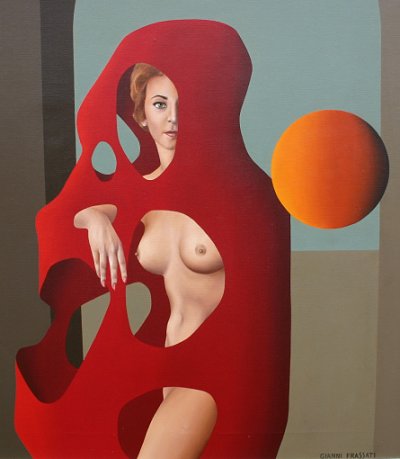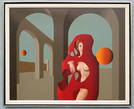 FRASSATI, Gianni, (Italian, 20th C): Surreal nude in landscape, Acrylic/C, signed lower right, metallic custom frame, 31 1/2'' x 39 1/4''. From the Beatrice Altman collection. Est. $1500/2500**