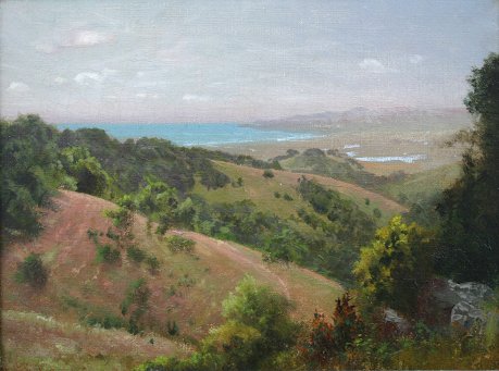 ROBINSON, Charles Dorman, (American, 1847-?): California coastal from the hills, O/C, 12'' x 16'', signed lower left, heavily worn period frame 18'' x 22''.