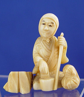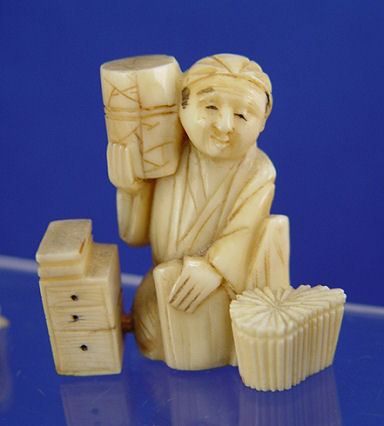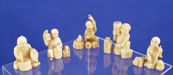 GROUP OF 5 JAPANESE CARVED IVORY NETSUKES: Each is in the form of a vendor, one is signed. 1 1/2'' - 1 7/8'' .