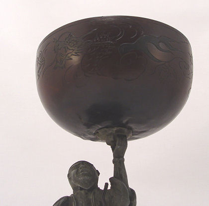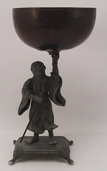 CHINESE BRONZE BOWL ON FIGURAL STAND: Elder man (lead or pewter) supporting a bronze bowl inscribed with a dragon design. 10 1/4''h, 5 1/2'' dia. Age unknown.
