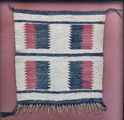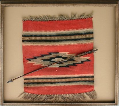 LOT OF 2 FRAMED NAVAJO MATS: One mounted with arrow, blanket 23'' x 18 1/2'' including post weave fringe, framed 27'' x 32''. The other behind glass, approx. 18'' x 16'', 26'' square overall. Sold as a lot, actual age unknown.