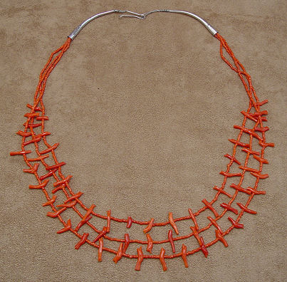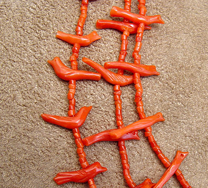 NATIVE AMERICAN CORAL FETISH NECKLACE: 64 coral birds on a triple strand necklace of coral beads, silver metal findings with sunburst decoration, approx. 29''l.