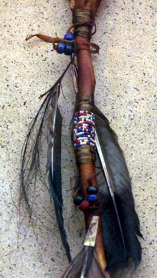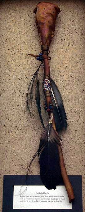 BUFFALO SKIN CEREMONIAL RATTLE: Decorated with beads and feathers, approx. 21''l., in a glass front shadowbox display, loose glass. Actual age unknown.