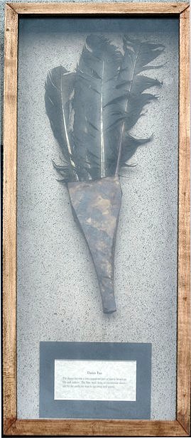 NATIVE AMERICAN STYLE CEREMONIAL DANCE FAN: Rawhide cased handle with four turkey? feathers, approx. 18''l. In a glass front shadowbox display, 25'' x 11'' x 2''. Actual age unknown.