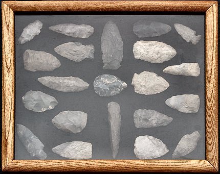 ESTATE LOT OF ARROWHEADS: 21 small arrowheads framed in shadow box behind glass, actual age unknown. 12'' x 15'' x 1 1/4''