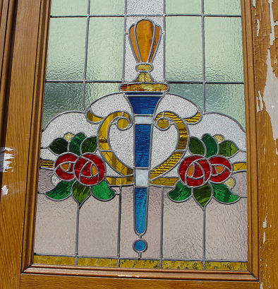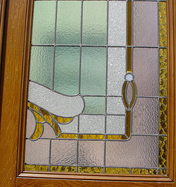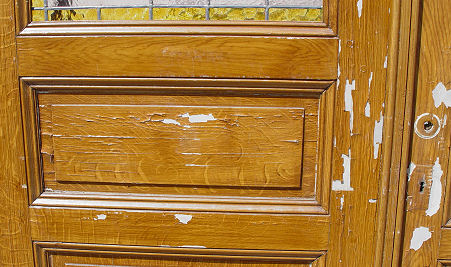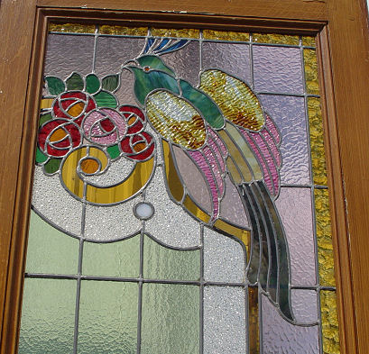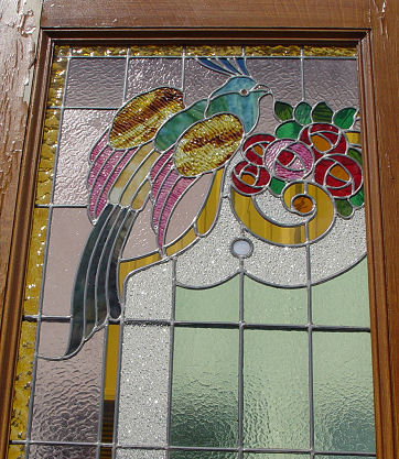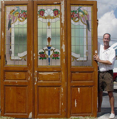 PALATIAL STAINED GLASS DOORS WITH EXOTIC BIRDS: Vintage architectural doors, grain painted finish is starting to peel. Each 8'8''h x 30 1/4'' x 2 1/4'' thick. Est. $3000/4000**