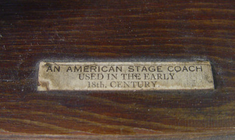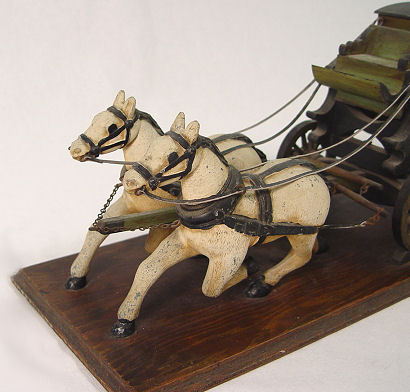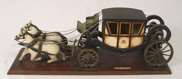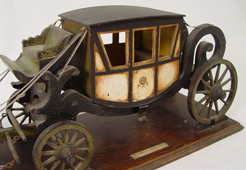 WOOD MODEL OF AMERICAN STAGE COACH: Folk art rendition of the American stage coach, mounted on wooden plinth, polychrome, age unknown, 12''l. x 8'' x 8''.