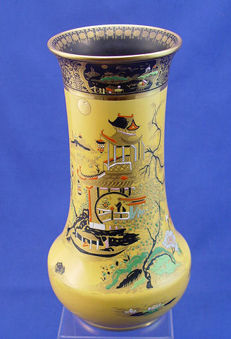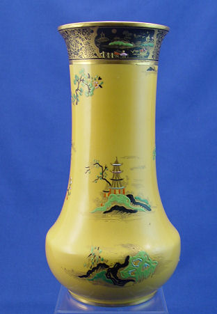 CARLTON WARE ORIENTAL DESIGN VASE: Vivid yellow ground, heavy enamel decoration. 10 1/4''h.