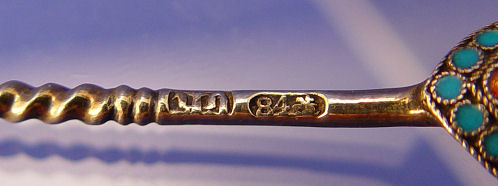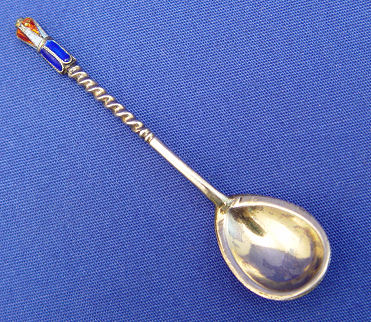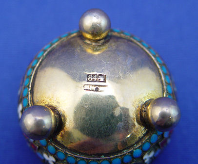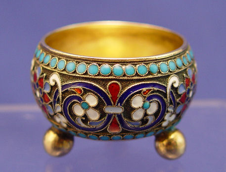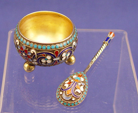 RUSSIAN ENAMELED OPEN SALT AND SPOON: Gold wash overall with scrolling floral design to exterior of salt and back of spoon. Open salt raised on 3 small ball feet. Both spoon and dish with 84 Moscow marks, unable to make out makers marks, but purported to be Gustas Klingest Moscow 1891-1896.
