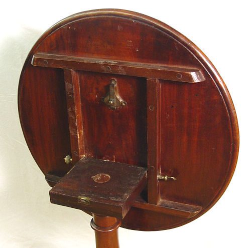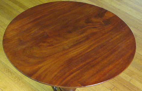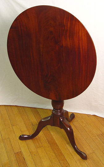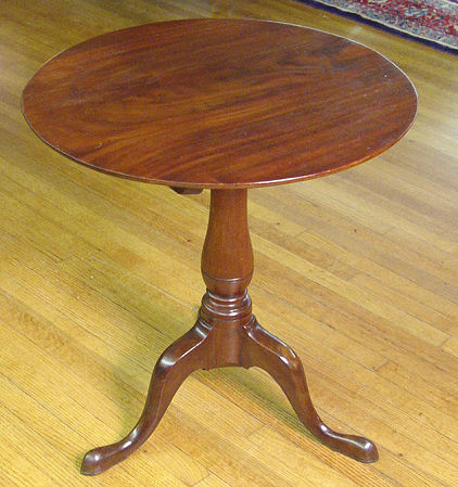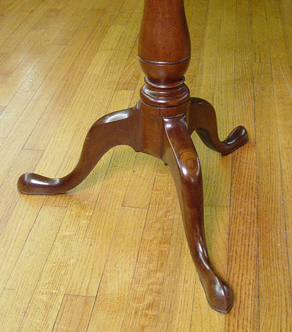 19th C QUEEN ANNE TEA TABLE: Solid round top, vase shaped pedestal base, trio of legs ending in snake feet. 22'' dia., 28''h.