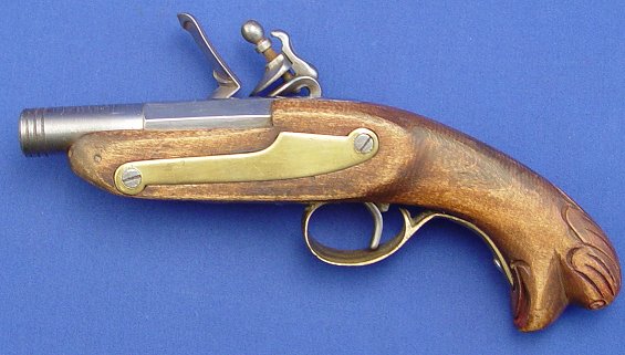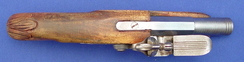 CARVED BIRD HANDLE FLINTLOCK PISTOL: 9'' overall, 3 3/4''. Sold as is.