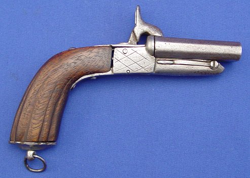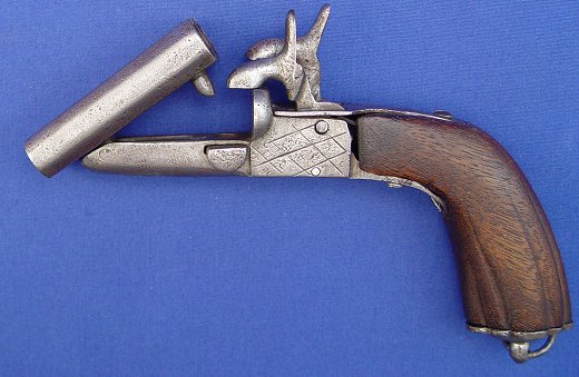 DOUBLE BARREL PISTOL: Probably 19th C., one trigger is not working, 6 1/2'' overall, 2 1/2'' barrel. Sold as is.