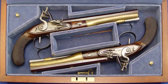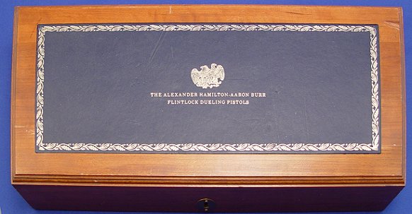 AUTHORIZED MUSEUM QUALITY REPLICAS OF GEN. ALEXANDER HAMILTON & AARON BURR FLINTLOCK PISTOLS: Excellent condition, incised Wogdon, casts were taken from the exact guns used in the duel, numbered 521a and 521b out of a reported 1200 issued, sold with commemorative case.