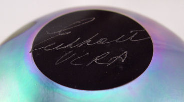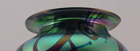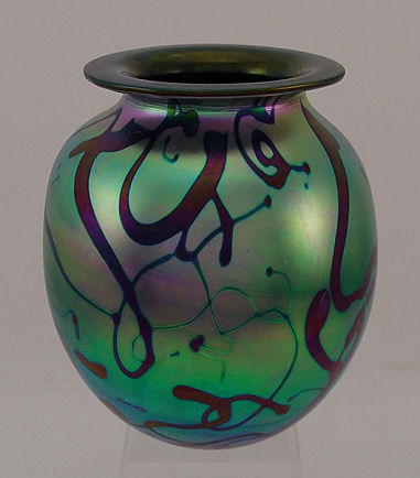 EICHOLT ART GLASS VASE: Iridised blue flared lip vase with bulbous body signed in script. 7''h.