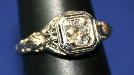 18K FILIGREE DIAMOND RING, CA 1900: Approx. 1/2ct old Euro cut diamond set in a filigree mount of 18k white gold, size 6.5, 2 grams. Est. $600/800**
