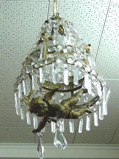 DIMINUTIVE CRYSTAL CHANDELIER WITH CHERUB: The gilt metal cherub is suspended from the center of a chain prism chandelier. Hangs 15'', 9'' dia.