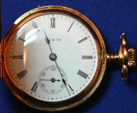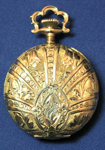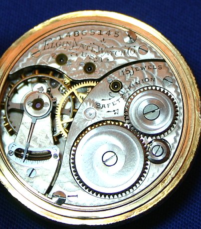 ELGIN 14K GOLD POCKET WATCH, CA 1909: 14k yellow gold hunt case with elaborate band and floral design to both sides. Works model 2 size 0 serial number 14865145 15 jewel, case marked Roy 14k 528196 14K585/1000Fine. Currently keeping time.