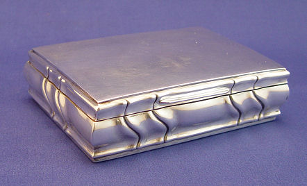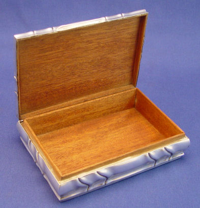 WOOD LINED STERLING BOX: Rectangular box with hinged lid, lovely lyrical design to sides, marked 925 Sterling, HA? in shield under crown mark, overall 5 11/16'' x 4'' x 1 1/2'', interior 5 1/4'' x 3 1/4'' x 7/8''. Please note tiny ding to back edge of top and middle back side.