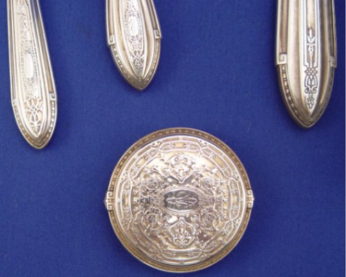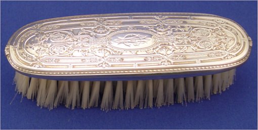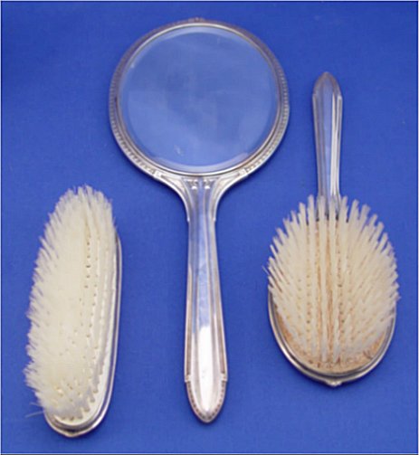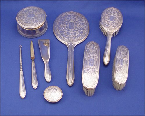 8 PIECE Mc CHESNEY STERLING DRESSER SET: Ca. early 20th C. To include hand mirror, covered powder jar, hair brush, small clothes brush, larger clothes brush, shoe horn, file, and shoe button hook. Only the shoe horn has dents. Monogrammed. The McChesney Co., Newark NJ. Founder Samuel McChesney was brother of Wm. McChesney, president of Dominick & Haff.