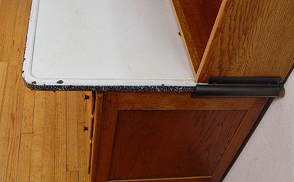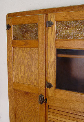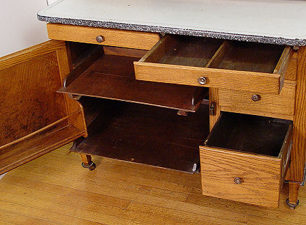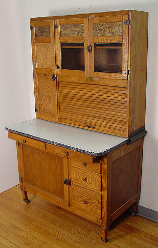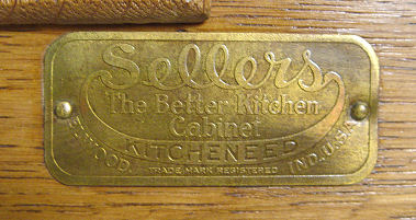 SELLERS VINTAGE OAK HOOSIER TYPE KITCHEN CABINET: Featuring pull out porcelain top, roll down storage compartment, 5 drawers, interior is in as good condition as exterior. Metal ''Sellers'' nameplate. 70 1/2''h, x 41'' with work surface extended, x 33''.