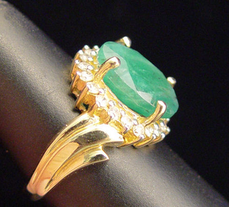 LADY'S EMERALD & DIAMOND DINNER RING: Oval cut emerald measuring approx. 13 x 10 x 5mm, surrounded by ring of small diamonds, all set in 14k yellow gold. Size 7, 6 grams.