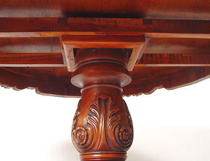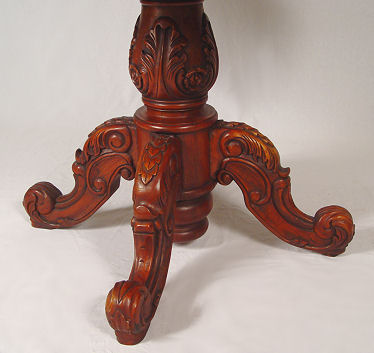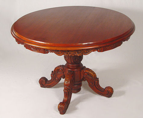 CARVED MAHOGANY ROUND CENTER TABLE: Carved with single pedestal and skirt, tiered beveled edge, Ca later 20th Century. Est. $400/500**