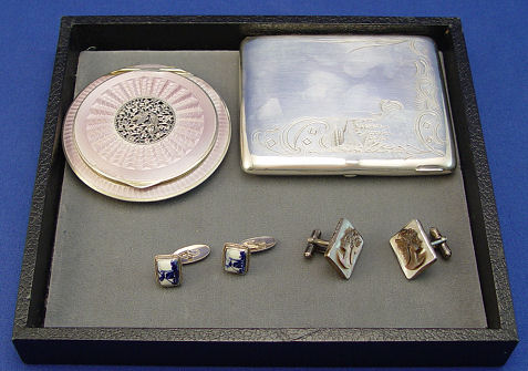 4 PIECE ESTATE LOT: To include, Cameo & Delft cufflinks, Austrian guilloche compact and a Russian silver cigarette case. Soft shell cameo cufflinks set in 835 silver, approx. 11/16'' x 7/8''; Delft with traditional windmill scene, marked 835 in sword (post 1953); sterling silver with lavender guilloche enamel compact centered by filigree panel depicting two birds amongst the flowers, marked Sterling Silver Made in Austria 935 KF, please note unfortunate damage to some of the enamel on front seems to possibly have been repaired, beveled mirror breaking inward, approx. 3 3/8'' diam.; and a circa 1910 Russian cigarette case, engraved with trees to back and landscape with house to front, marked 84 and right facing Kokoshnik, Moscow and IKK in Cyrillic. Approx. 4 1/8'' x 3 3/8''.
