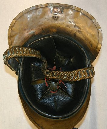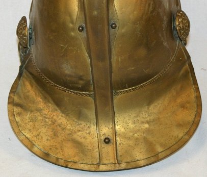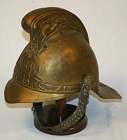NEW SOUTH WALES FIRE BRIGADE BRASS HELMET: Brass fireman's helmet complete with leather lining and link chin guard. The links graduate in size, the embossed winged dragon plume is attached with screws and acorn nuts. Unpolished, minor denting.