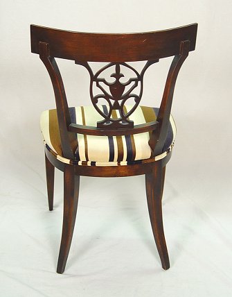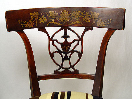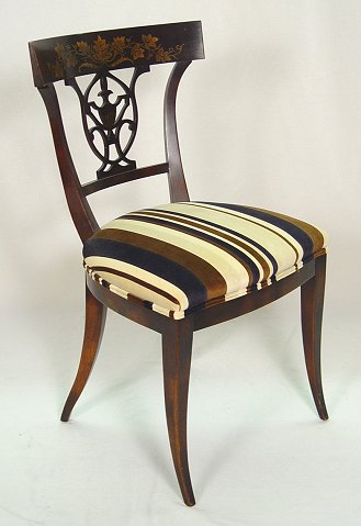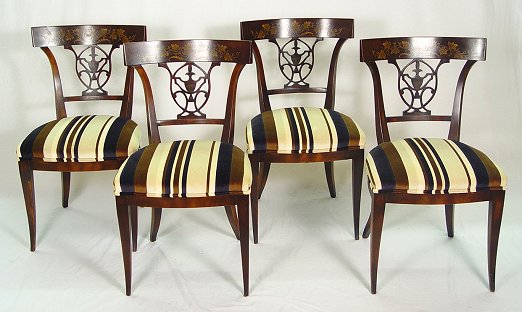 FINE SET OF 4 MAHOGANY REGENCY SIDE CHAIRS: Hand painted leaf design on the curved top rails, pierce carved splats, shaped seat, tapered front legs. 34''h, 19'' wide seat, 16'' deep. 20th C.