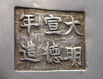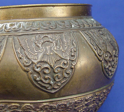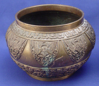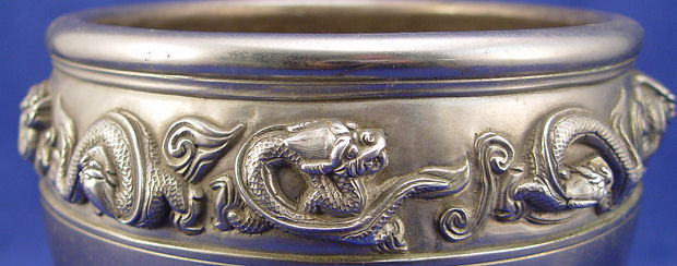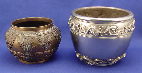 2 ORIENTAL BRONZE JARDINIERES: 1) Bronze jar in a geometric design, unsigned, 5''h. x 5 1/2'' dia. 2) White bronze ? dragon decorated pot, character marks on the underside, 6 1/2''h. x 7 1/2'' dia.