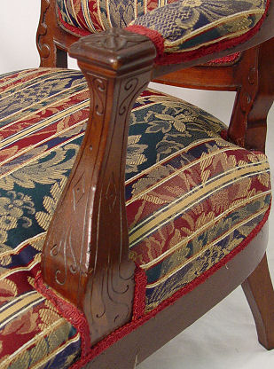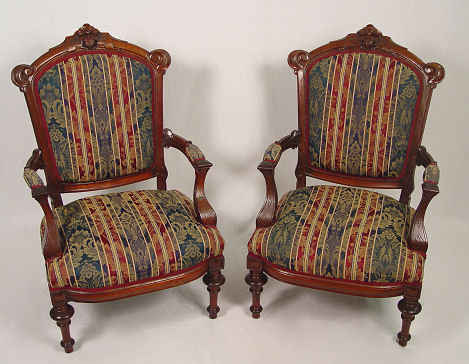 PAIR OF FINE VICTORIAN OPEN ARM PARLOR CHAIRS: Carved walnut rococo revival frames with arched top rails, matched pair. Later upholstery 40 1/2'' h back, 26'' w x 22'' d.
