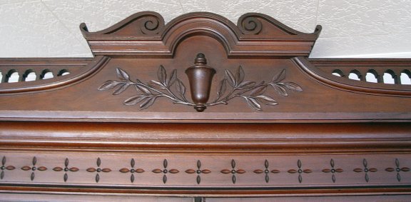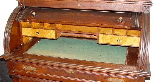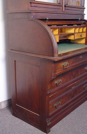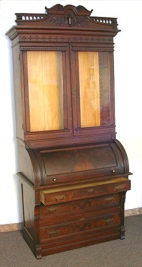 VICTORIAN WALNUT CYLINDER ROLL SECRETARY DESK: Bookcase secretary top section has carved crest and spoon carved top rail. Lower section is a roll top desk fitted with interior drawers and cubicles, felt writing surface. Three drawers under desk, with upper drawer extending over lower two. Approx. 93''h, x 33'' x 23''. 86''h without removable top crest.