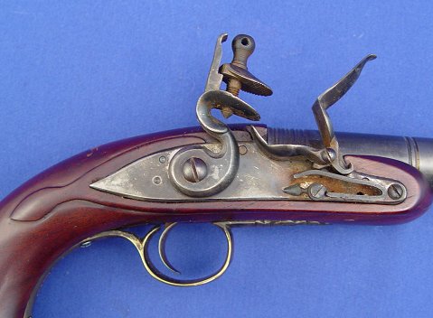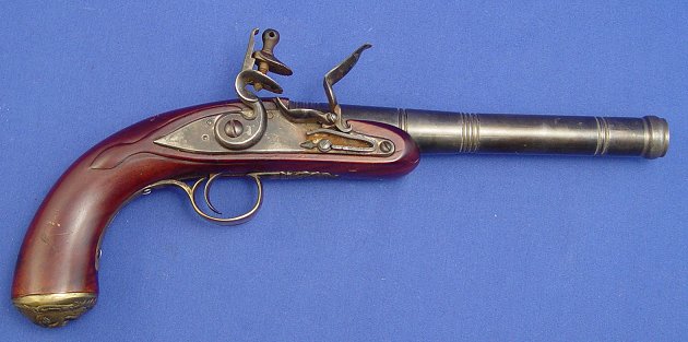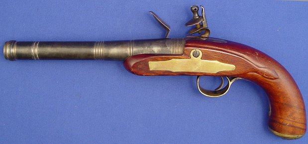 50 CAL. FRENCH FLINTLOCK PISTOL: 20th C., 13'' overall, 7 1/2'' barrel, masqueron butt cap, probably Italian reproduction. Sold as is.