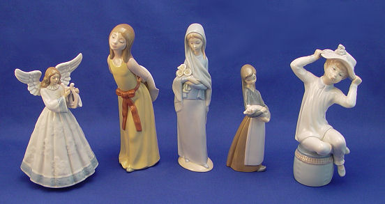 5 LLADRO PORCELAIN FIGURES: Includes ''Naughty Girl'' #5006 issued 1978, approx. 7 1/2'' h; ''Heavenly Harpist'' tree topper #5830, approx 7 1/2'' h; ''Girl with Bonnet'', #1147, 8 1/4'' h; ''Girl With Pig'' #1011 issued 1969, approx. 6 3/4'' h; ''Girl With Calla Lilies'' #4650, approx. 9''.