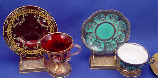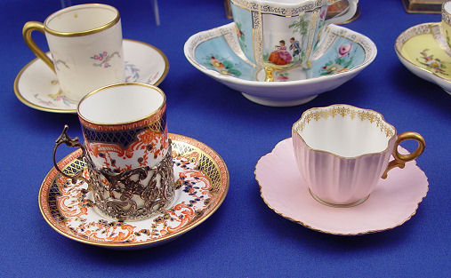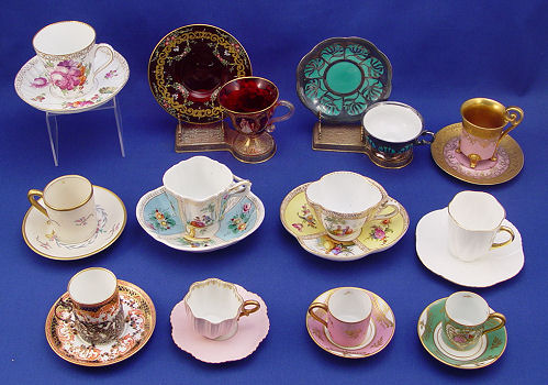 IMPORTANT ESTATE COLLECTION OF 12 DEMI CUPS & SAUCERS: To include Dresden, Sevres, Shelley, Venetian glass, Limoges, Royal Crown Derby, and a German silver overlay. The smallest is 1 1/2'' dia., the largest Dresden is 3'' dia. All are in fine condition.