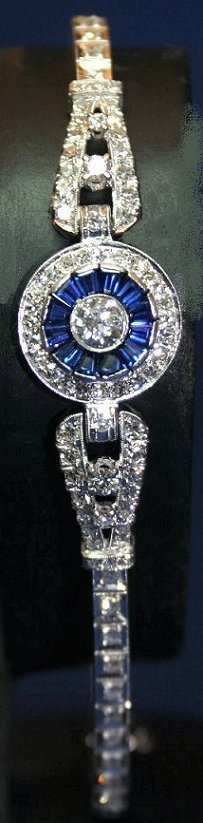 BEAUTIFUL 3.5CTW DECO SAPPHIRE AND DIAMOND PLATINUM BRACELET: Center by a 53pt Euro cut diamond, 5 x 2.9mm, purported G color and VS clarity surrounded by ring of tapered baguette sapphires, approx. 1ctw. Continuing down the bracelet are approx. 100 smaller diamonds, approx. 3ctw, to hook clasp and safety chain, clasp marked 10% Irid Plat 7821, approx. 7''l., 15.6 grams. Est. $3500/5000**